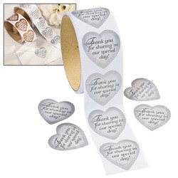 Silver Heart Thank You Roll Stickers. Great for wedding favor bags and thank you cards . Each heart-shaped sticker reads Thank you for sharing in our special day
